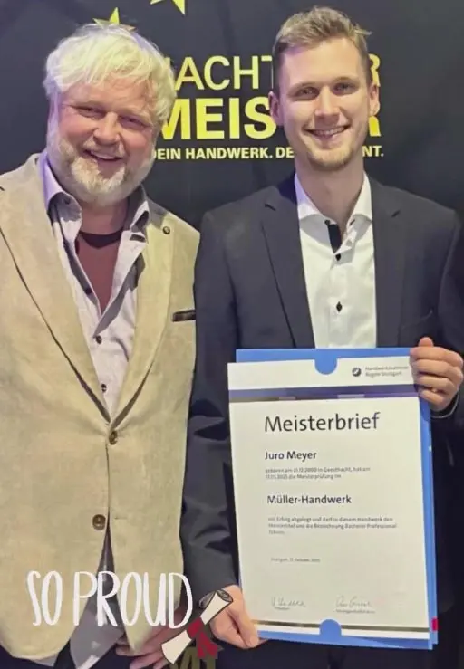 Ein ganz besonderer Moment für unsere Mühle: Der stolze Windmüller Eckhard feiert in Stuttgart bei der Nacht der Meister die feierliche Übergabe des Meisterbriefs an seinen Sohn Juro. Mit ihm steht nun die 7. Generation Müller im Mühlenland am Start – ein Stück gelebte Tradition, das uns mit Dankbarkeit und Stolz erfüllt. Dieses Bild hält einen Augenblick fest, der zeigt: Handwerk, Herzblut und Familie – das sind die Flügel, die unsere Mühle am Laufen halten.