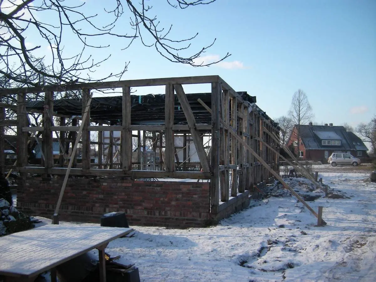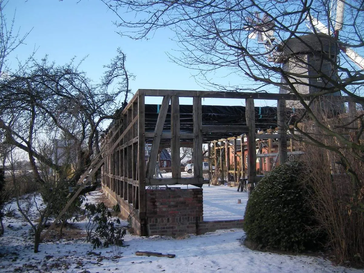 Eine zweite, sehr viel größere Scheune wurde uns ebenfalls zum Abbau angeboten. Müllerfamilie Engel aus Oldendorf/Luhe freute sich über eine Weiterverwendung ihrer 12x40 m großen, aus dem 19ten Jahrhundert stammenden Fachwerkscheune. Die Zerlegung war auf Grund der Größe recht aufwendig und ohne die Hilfe eines Teleskopladers nicht zu bewältigen. Auch die Feldsteine, auf denen das Café heute steht, haben wir mit unserem kleinen Mühlenlaster nach Bardowick bewegt. Material war also reichlich vorhanden.