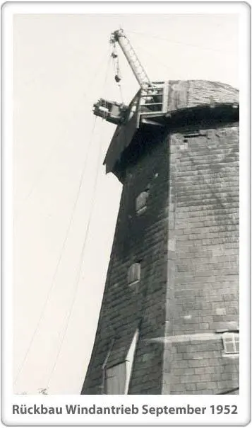 Die Mühle ist in keinem guten Zustand. Zunächst kann nur mit Windkraft und einem Schrotgang gearbeitet werden - es muss viel repariert und improvisiert werden. Aber eine umfassende Grunderneuerung kann nicht finanziert werden. Im Jahre 1952 werden Flügelkreuz, Kappe, Windrose und die Königswelle ausgebaut. Die Mühle erhält ein Spitzdach und die Maschinen werden auf elektrischen Antrieb umgerüstet.