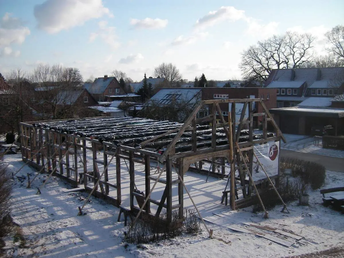 Eine zweite, sehr viel größere Scheune wurde uns ebenfalls zum Abbau angeboten. Müllerfamilie Engel aus Oldendorf/Luhe freute sich über eine Weiterverwendung ihrer 12x40 m großen, aus dem 19ten Jahrhundert stammenden Fachwerkscheune. Die Zerlegung war auf Grund der Größe recht aufwendig und ohne die Hilfe eines Teleskopladers nicht zu bewältigen. Auch die Feldsteine, auf denen das Café heute steht, haben wir mit unserem kleinen Mühlenlaster nach Bardowick bewegt. Material war also reichlich vorhanden.