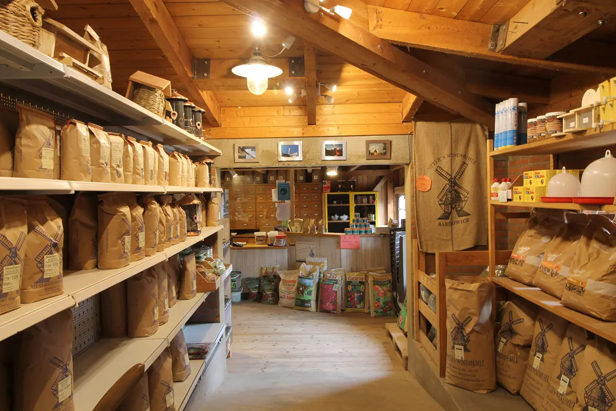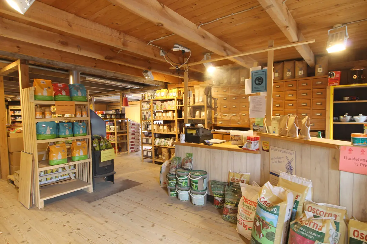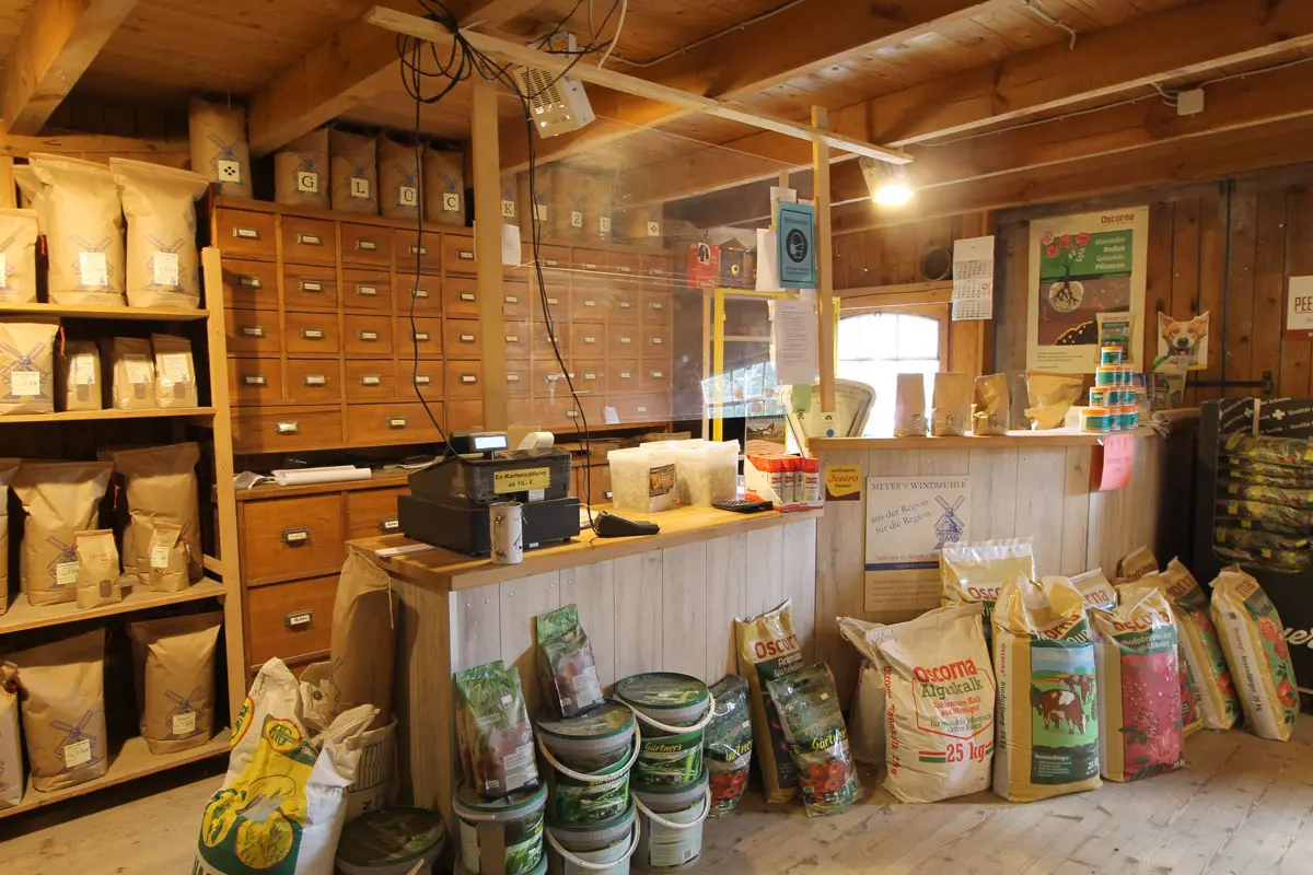 Im Erdgeschoss der Mühle befindet sich seit den Achtziger Jahren unser Mühlenladen. Er ist Dienstags bis Samstags von 9-18 Uhr geöffnet. Auf über 200 Quadratmetern finden Sie ein umfassendes Sortiment eigener Produkte und ausgesuchter Artikel aus den Bereichen Lebensmittel, Futtermittel, Gartensämereien. Wir legen Wert auf Bioqualität.